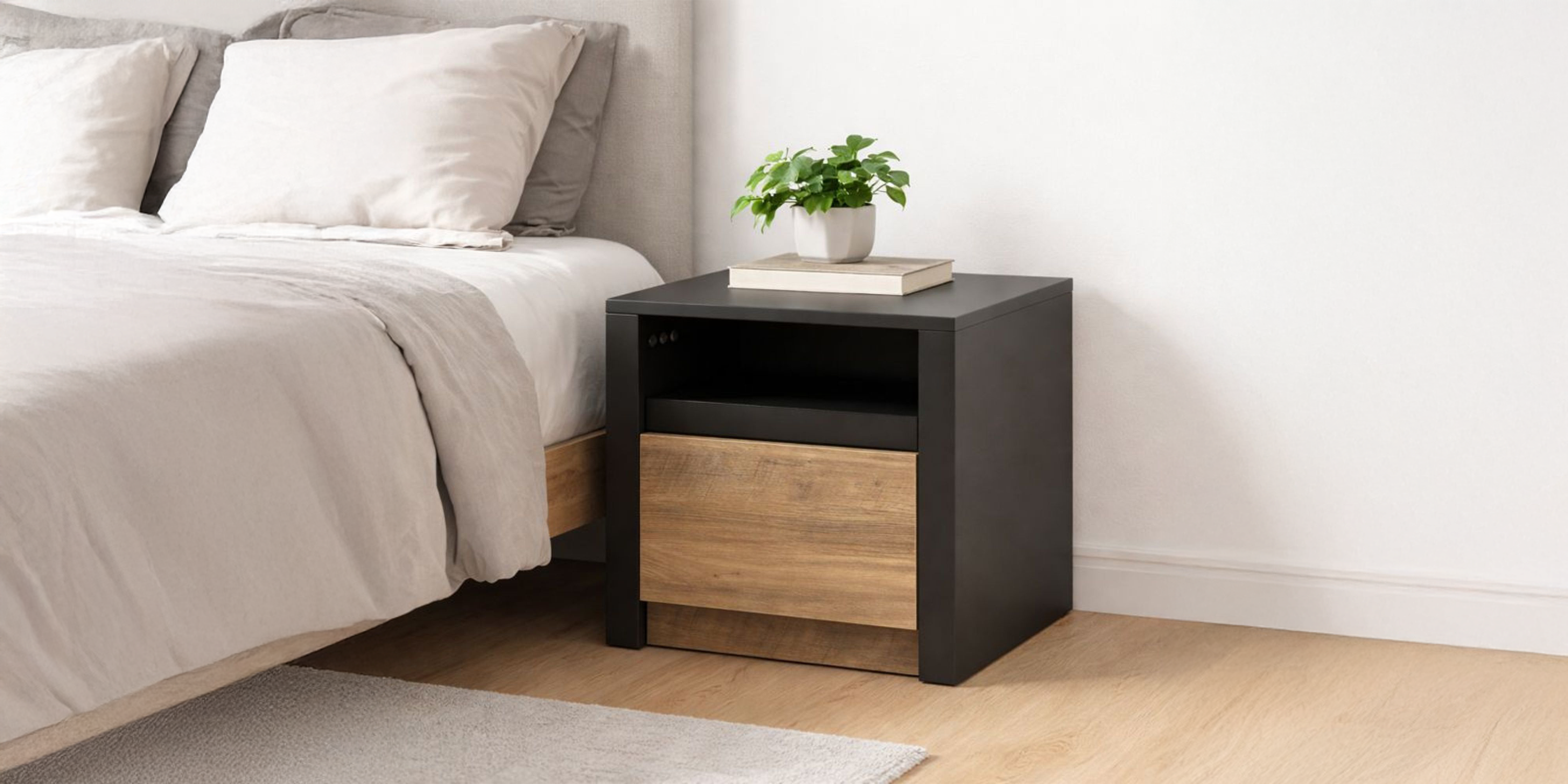 Dit moderne nachtkastje combineert een strak zwart design met warme eiken accenten en praktische opbergruimte.